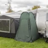 Niets is zo vervelend als je in een krappe caravan in je zwemkleding moeten hijsen. Deze pop-up tent biedt je die broodnodige extra ruimte. Met een grondoppervlak van 120 bij 120 centimeter heb je voldoende bewegingsvrijheid. De tent is gemaakt van stevig materiaal dat ongewenste inkijk voorkomt, zodat je met een gerust hart kunt douchen of het chemisch toilet kunt gebruiken.